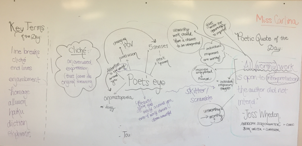 We moved on to our Quote of the Day, by the American screenwriter, comic book writer, + composer Joss Whedon: “All worthy work is open to interpretations the author did not intend.” Students talked in their table-groups about their thoughts on this quote, and we came together as a larger class to REVISE Whedon’s statement. As a collective class, in fact, we believe that ALL work is worthy of interpretations that were unintended by the authors, and that unexpected interpretations by readers can actually inform and allow the writer for more opportunity to grow. Students came up with personal examples, such as unintended responses of humor that peers exhibited towards their own work, which, in turn, influences the future of their writing!