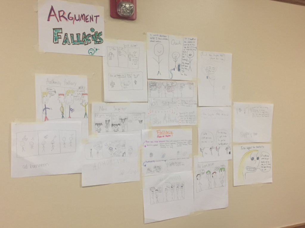 We distinguished between motif and theme, as these are commonly mistaken for one other — ask your child the difference! Students then watched a short PBS video detailing aspects of major logical fallacies: the strawman fallacy, ad hominem, the black and white (or false dichotomy) fallacy, and appeals to false authority. Students came up with examples of each of these fallacies during class discussion. We explored additional fallacies, such as non-sequitur, ad populum, and post hoc, ergo propter hoc. The students demonstrated newfound knowledge by illustrating examples of the fallacies using creative instruments, which you will get to view at Open House tomorrow at 3:15!