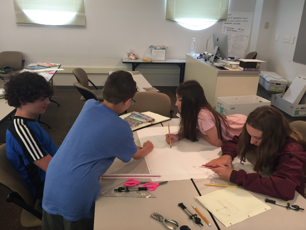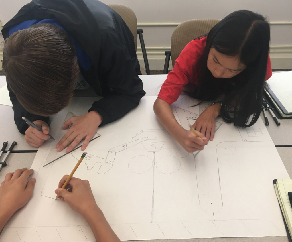 The rest of the day was devoted to final poster projects. Groups of three worked on depicting a mechanism that consisted of pulleys, gears, and linkages to perform a simple task in a complicated way. They created rough sketches, drew detailed drawings of connections, and finally transferred their ideas using drawing tools to poster paper. The results were presented during the open house!