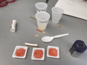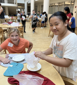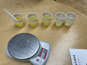Monday: Today has been a busy day! We started the day getting to know each other and the rules of the lab. Did I mention that we get to meet in a high school lab classroom? Then we started talking about atoms, compounds, and the polarity of molecules. Campers learned that opposite charges attract and that polar and nonpolar liquids like oil and water don’t mix. We then performed an experiment using honey, dry mustard, and tomato paste as emulsifiers to get oil and vinegar to mix and learned that mustard is the best emulsifier. Our emulsions were left on the bench while we went to lunch and the mustard emulsion still had not separated. After lunch we stayed in the lunch area and learned about percent solution by doing a lemonade lab. Each group chose 5 concentrations of lemonade to make. They weighed out the lemonade mix using an electric balance and then added water to make their solutions. After stirring, they tried their creations. The label on the container suggested a concentration of 7% lemonade mix in water. The most popular concentration was 10% with a few brave souls who tested and preferred a concentration of 50% lemonade mix (I don’t think it even all dissolved!) Overall, I think we had a fun and full day and I can’t wait to do more chemistry tomorrow.
