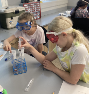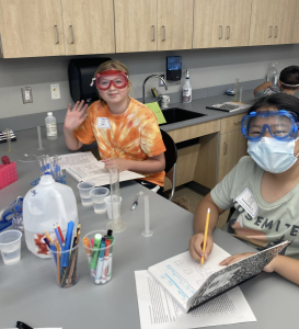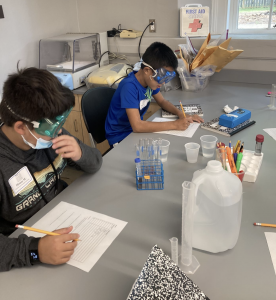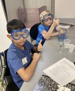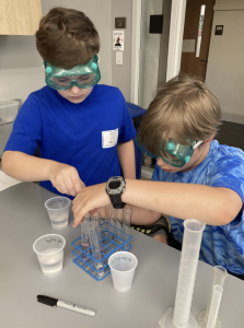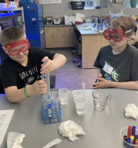 Wednesday: Today we have an experiment-packed day in chemistry. We started the day with a crystallization lab. Each group made a solution with a different amount of copper II sulfate and we let it crystallize all day. At the end of the day we examined The crystals that had formed and will look again tomorrow morning. After crystallization, we talked about acids, bases and pH. We learned that we all had acid breath because we can change a solution from a base to neutral just by blowing air into the solution with a straw. Campers tested a bunch of solutions using a variety of pH testing reagents. Finally lab groups tested a variety of solutions to see which one caused the most fizz in a sample of pop rocks. The results were split and might require further testing. Today was a lot of fun for me and I can’t wait to see everybody tomorrow.