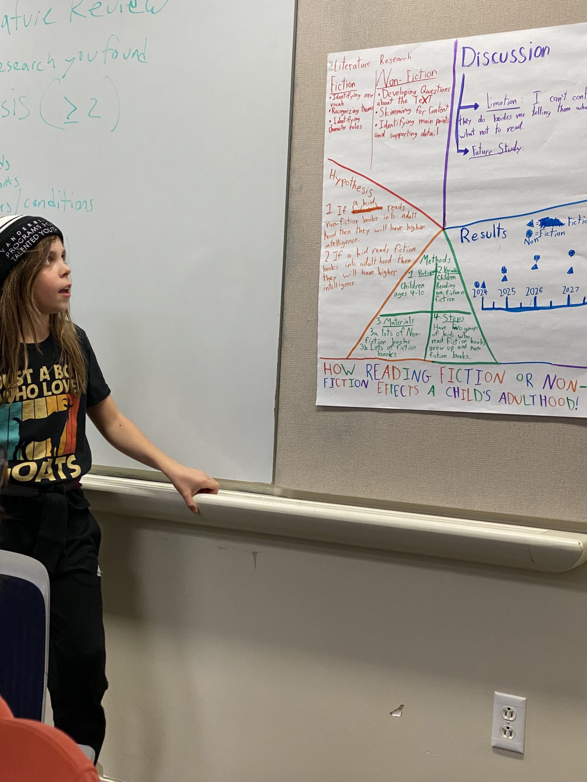 We then had each student take the time to create their own research study about media. They thought about what they observed in the world related to media, asked a question that led to a hypothesis, and then proceeded to design the individual components of their experiment. Students took this task seriously, asking important questions that were insightful and helpful for their fellow classmates. Students came up with fantastic ideas, ranging from the effect of Minecraft on aggression in children to how the type of media someone consumes influences their tennis skills to the way that Dance Moms changes young women’s respect of authority to how reading fiction vs. non-fiction books in childhood impacts intelligence in adulthood to the way that superhero films impact children’s imagination to how the show Bluey impacts social skills in comparison to Peppa Pig. We also discussed the individual parts of their research presentation, which they would be creating after doing some background research in the computer lab.