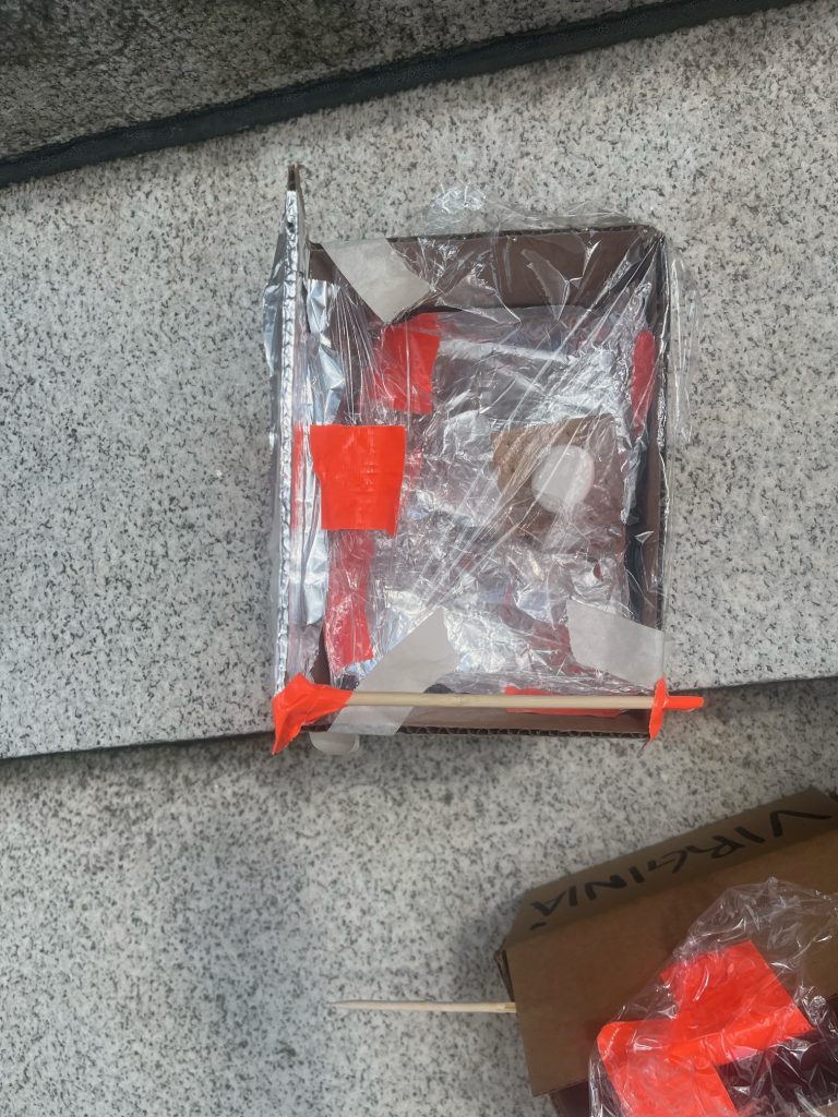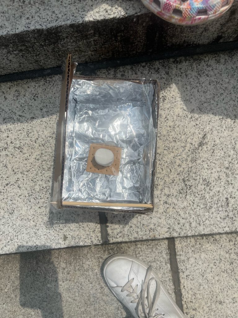 After lunch, we started on our solar ovens. The scientists have been asking about this all week, so they were thrilled to get started. Our scientists were given their materials and tasked with making an oven capable of heating their marshmallows. The solar oven uses concepts of the sun, rays of sunshine, light, shadows, and the Greenhouse Effect. Scientists were given a box, tin foil, and plastic wrap, and tried to create their ovens without guidance. After some practice and a little guidance, the scientists were given another box and a tutorial on how to make an effective solar oven. We set the ovens outside in the sun for about 30 minutes, and most scientists came back to a soft marshmallow. It was so fun to add our chocolate and enjoy a snack on a warm summer afternoon. The scientists discussed which design worked better, their initial design, or the design provided by NASA, and why. Once again, I will not be surprised if many scientists ask to repeat this activity at home, as most scientists named this activity as their favorite from the week. https://climatekids.nasa.gov/smores/