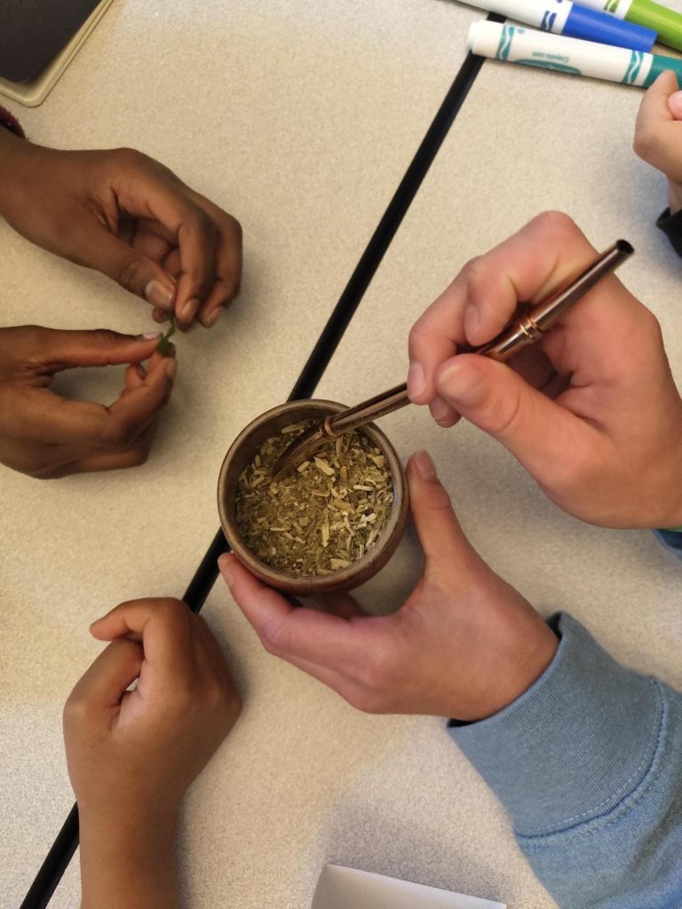 We kicked off the day with an exploration of tereré, a South American tea ritual. This activity served as an introduction to the basic concepts of cultural anthropology, including ethnographic fieldwork (including participant observation and interviews), the difference between cultural relativism and ethnocentrism, and the cultural importance of rituals. While trying the tea, students documented their sensory observations as well as reflections on the ritual in their field journals, fostering their skills as budding anthropologists. Many students didn’t appreciate the bitter, earthy taste, but were happy to take home the guampa (cup) and bombilla (filtering straw) to try other loose-leaf teas at a later time!