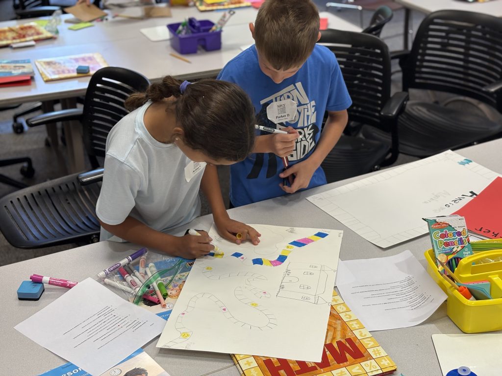 After lunch, students put the finishing touches on their original board games. Students then became game testers, playing each other’s creations and offering thoughtful feedback. They’ll be bringing home additional cards to continue developing their games into polished prototypes.