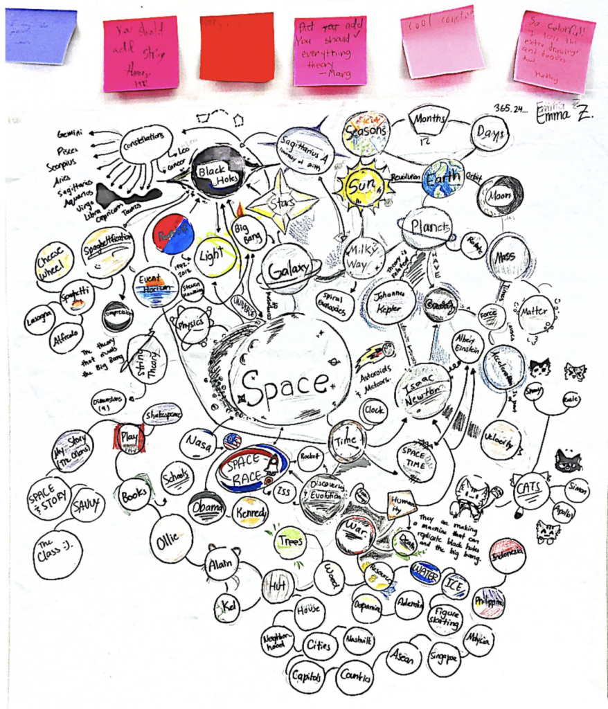 We started our day by sharing science fiction stories that students wrote yesterday: they sat in a circle and read aloud, blending the mastery of the written word with performance. After the literary reading, students completed a gallery walk through the stories laid out on the tables, and each student left feedback on a sticky note for every story. Following the readings and the feedback, students were tasked with weaving their stories into the Space Concept Maps, which they have completed brilliantly, making connections between art, the written word, and scientific concepts.