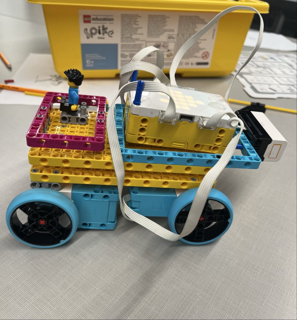 Next, students were able to get familiar with our LEGO Spike Prime robots. Students brainstormed with their team about a job that they would like their robot to help with, specifically something that would make their morning better. Students then designed and built their robots using LEGO pieces. They then used block code to write a program for the robot to carry out its task. Some students completed this task and were able to move on to building a break-dance robot.